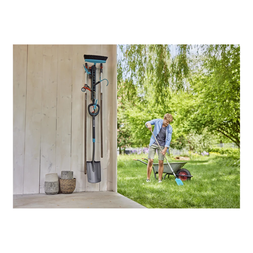 Met het GARDENA combisystem Gereedschapsrek Flex heb je ruimtebesparende opslag voor je GARDENA combisystem-accessoires en -stelen. Het Gereedschapsrek Flex heeft vier gereedschapshouders, inclusief een klein haakje voor het opbergen van kleine gereedschappen, snoeischaren en scharen, maar ook een universele haak. De gereedschapshouders zijn flexibel en vrij plugbaar, en je kan ze in stappen van 30° draaien om ze naar wens te positioneren. De houders zijn geschikt voor het opbergen van je GARDENA combisystem- en Original GARDENA System-accessoires. De universele haak laat je tuingereedschappen zoals schoppen opbergen. Je kan het gereedschapsrek verticaal of horizontaal uitlijnen, om de ruimte op je muur optimaal te benutten. Daarnaast biedt het gereedschapsrek ruimte voor tot wel 4 combisystem-stelen, dankzij de metalen hangers. Als je meer gereedschappen wil opslaan kan je het rek uitbreiden met het Gereedschapsrek Flex (art. nr. 3507-20). Je kan stelen die geen onderdeel vormen van het combisystem opbergen met de Steelhouder Flex (art. nr. 3508-20), met een horizontale uitlijning. Als je binnen 3 maanden na aankoop registreert bij gardena.com/registration, ondersteunt GARDENA het combisystem Gereedschapsrek Flex met een garantie van 25 jaar. Let your tool family grow. GARDENA combisystem. Verwisselbaar. Duurzaam. Voor al je tuinwerk.