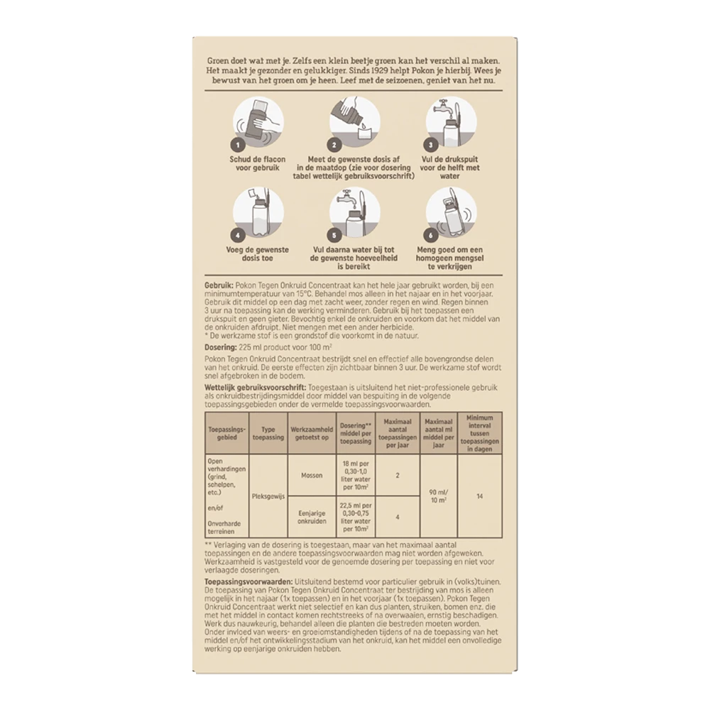 Pokon Tegen Onkruid Concentraat bestrijdt snel en effectief alle bovengrondse delen van het onkruid. De eerste effecten zijn zichtbaar binnen 3 uur. De werkzame stof wordt snel afgebroken in de bodem. Pokon Tegen Onkruid Concentraat kan het hele jaar gebruikt worden, bij een minimumtemperatuur van 15 graden Celsius. Behandel mos alleen in het najaar en in het voorjaar. Gebruik dit middel op een dag met zacht weer, zonder regen en wind. Regen binnen 3 uur na toepassing kan de werking verminderen. Gebruik bij het toepassen een drukspuit en geen gieter. Bevochtig enkel de onkruiden en voorkom dat het middel van de onkruiden afdruipt. Niet mengen met een ander herbicide.