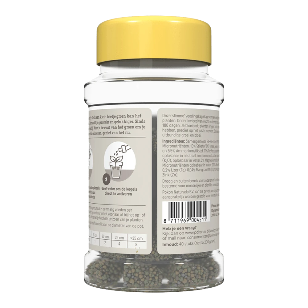 Met de Pokon Terras & Balkon Planten Voedingskegels geef je jouw planten een heel seizoen voeding. Duw de voedingskegels naast de plant en geef water. Doe dit bij voorkeur in het voorjaar of bij het op- of verpotten van je planten. Onder invloed van vocht en temperatuur geven de voedingskegels tot wel 180 dagen voeding af.
